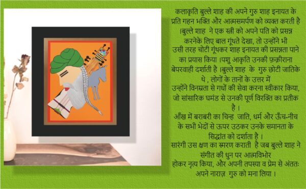 कलाकृति बुल्ले शाह की अपने गुरु शाह इनायत के प्रति गहन भक्ति और आत्मसमर्पण को व्यक्त करती है ।