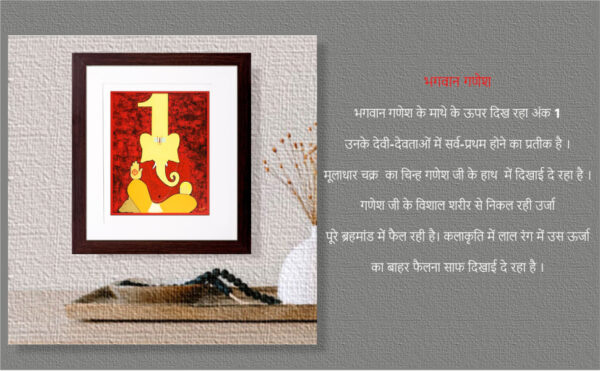 कलाकृति में भगवान गणेश के माथे के ऊपर दिख रहा अंक 1 उनके देवीदेवताओं में सर्वप्रथम होने का प्रतीक है   मूलाधार चक्र  का चिन्ह गणेश जी के हाथ  में दिखाई दे रहा है   गणेश जी के विशाल शरीर से निकल रही उर्जा पूरे ब्रहमांड में फैल रही है। कलाकृति में लाल रंग में उस ऊर्जा का बाहर फैलना साफ दिखाई दे रहा है ।