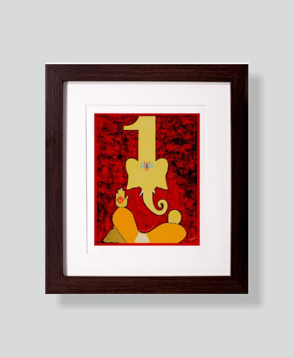 Artwork depicts ‘Pradhv'(Ganesha) as Lord of Muladhara Chakra who is 1st amongst all represented by fig 1 & the colour ‘Red’ emanating from his ‘Body’ symbolizes this concept of his being the ‘Root'(Deity of Muladhara Chakra) of all human consciousness.Shown on his ‘Hand’ is the esoteric symbol of ‘Muladhara Chakra’.