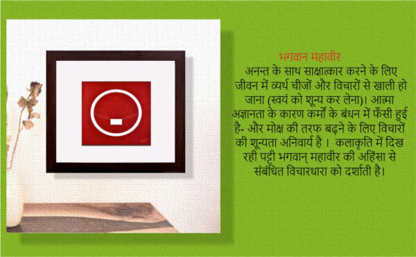 अनन्त के साथ साक्षात्कार करने के लिए जीवन में व्यर्थ चीजों और विचारों से खाली हो जाना (स्वयं को शून्य कर लेना) जिस के फल स्वरूप ही मानव सचाई से परिपूर्ण हो सकेगा क्यूंकि आत्मा अज्ञानता के कारण कर्मों के बंधन में फँसी हुई है– और मोक्ष की तरफ बढ़ने के लिए विचारों की शून्यता अनिवार्य है । कलाकृति में दिख रही पट्टी भगवान् महावीर की अहिंसा से संबंधित विचारधारा को दर्शाती है।