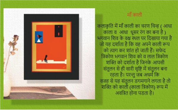 रक्तबीज के संहार के पश्चात काली माँ नरसंहार करने लगी, जिसको रोकने हेतु भगवान शिव उनके मार्ग में लेट गए और जैसे ही माता का पैर उनके शरीर पर पड़ा तो विस्मय से उनकी जिह्वा बाहर निकल आई और उन्होंने नरसंहार रोक दिया। कलाकृति में माँ काली का चरण चिन्ह ( आधा काला व आधा धूसर रंग का बना है ) भगवान शिव के वक्ष स्थल पर दिखाया गया है जो यह दर्शाता है कि वह अपने काली रूप को त्याग कर शांत हो जाती हैं। सफेद त्रिकोण भगवान शिव को व लाल त्रिकोण शक्ति को दर्शाता है जिनके आपसी संतुलन से ही सारी सृष्टि में संतुलन बना रहता है। परन्तु जब अधर्म कि वजह से यह संतुलन डगमगाने लगता है तो शक्ति को काली (काला त्रिकोण) रूप में अवत्रित होना पडता है।