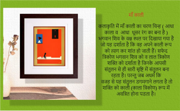 रक्तबीज के संहार के पश्चात काली माँ नरसंहार करने लगी, जिसको रोकने हेतु भगवान शिव उनके मार्ग में लेट गए और जैसे ही माता का पैर उनके शरीर पर पड़ा तो विस्मय से उनकी जिह्वा बाहर निकल आई और उन्होंने नरसंहार रोक दिया। कलाकृति में माँ काली का चरण चिन्ह ( आधा काला व आधा धूसर रंग का बना है ) भगवान शिव के वक्ष स्थल पर दिखाया गया है जो यह दर्शाता है कि वह अपने काली रूप को त्याग कर शांत हो जाती हैं। सफेद त्रिकोण भगवान शिव को व लाल त्रिकोण शक्ति को दर्शाता है जिनके आपसी संतुलन से ही सारी सृष्टि में संतुलन बना रहता है। परन्तु जब अधर्म कि वजह से यह संतुलन डगमगाने लगता है तो शक्ति को काली (काला त्रिकोण) रूप में अवत्रित होना पडता है।