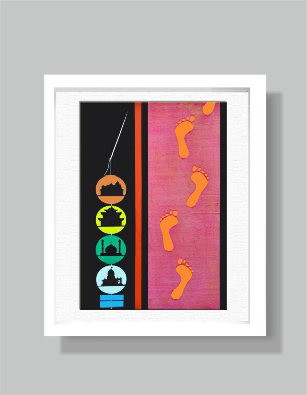 Footsteps seen in painting depicts Guru Nanak Dev Ji’s journeys. Guru Sahib gave equal respect to all religions and tried to imbue them with his teachings which is shown by the rosary threaded on one side of this painting. Sri Guru Nanak (Ek Noor)