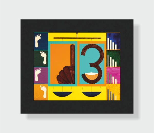 कलाकृति में दाईं ओर आसमान की तरफ इशारा करती एक उंगली यह संदेश दे रही है की परमात्मा एक है , साथ ही अंक 3 दिखाई दे रहा है जो पहले वाली आकृति के साथ मिलके अंक (13 ,  अर्थात सब तेरा है  प्रभु ) की झलक दे रहा है। पृष्ठभूमि में एक तराजू दिखाई दे रहा है जो उनके जीवन की एक प्रसिद्ध घटना से संबंधित है