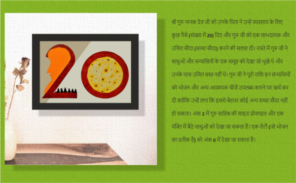 A roti ( which symbolizes the food) can be seen in numeric 0. Guru Sahib’s side profile and the Sadhus sitting in a row can be seen in Numeric 2.